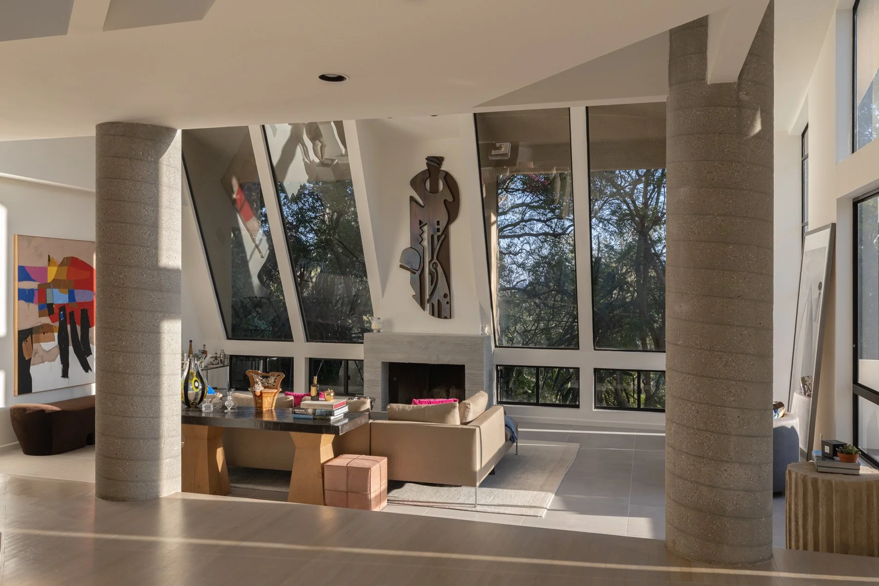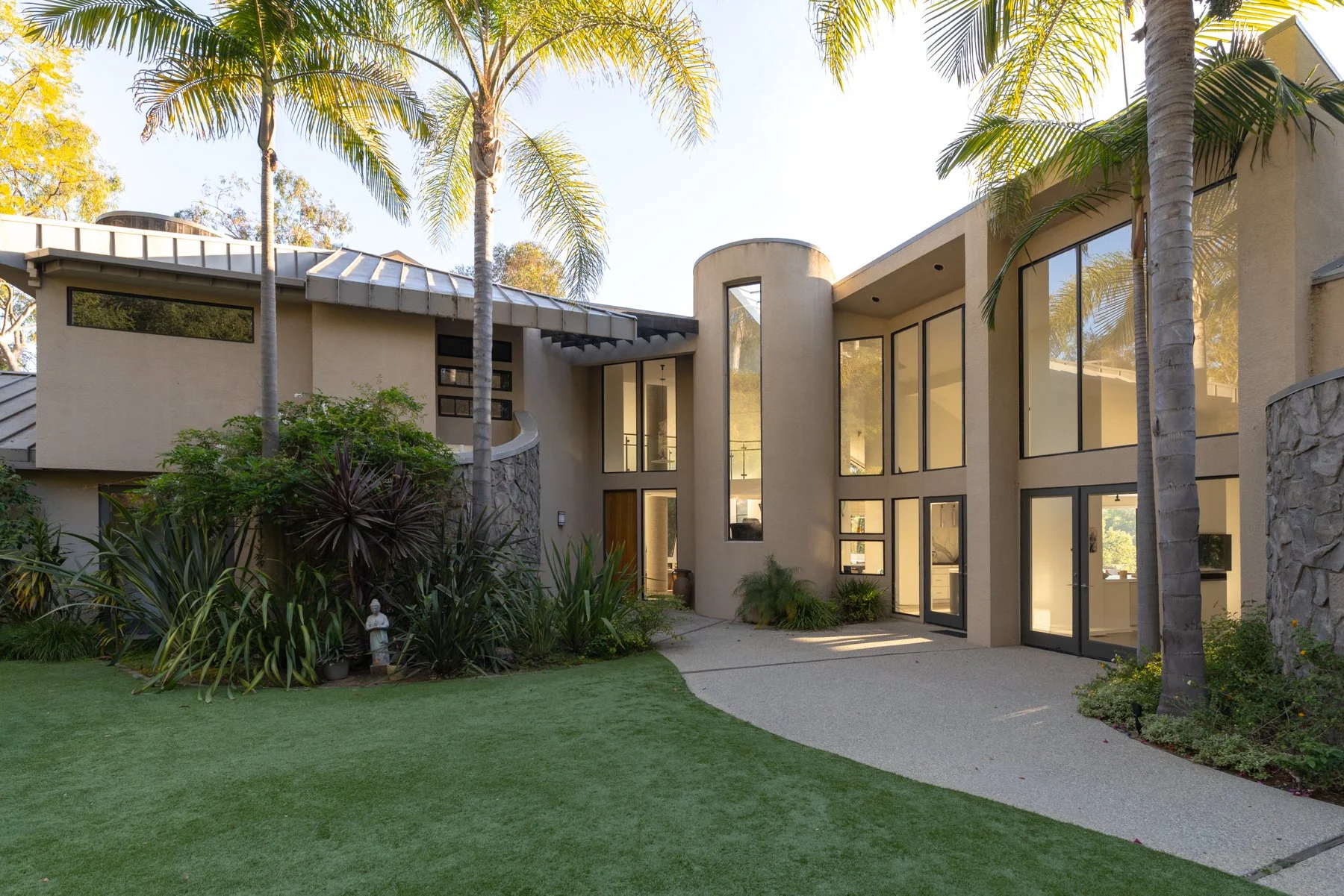 Tucked behind a long gated driveway on 2 completely secluded acres, this stunning 5-bedroom, 6-bath architectural masterpiece seamlessly blends concrete, glass, and light wood floors beneath soaring pitch roof ceilings and dramatic skylights.